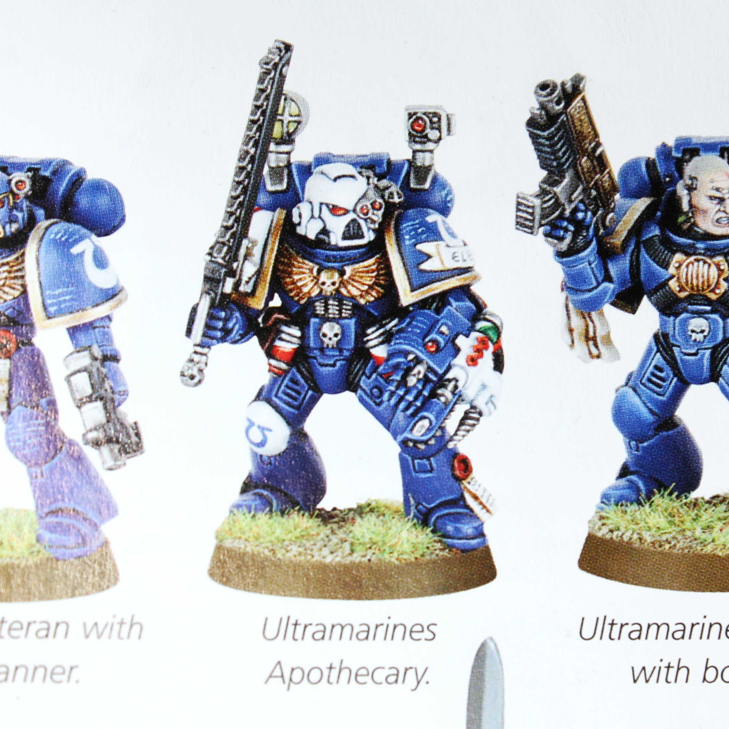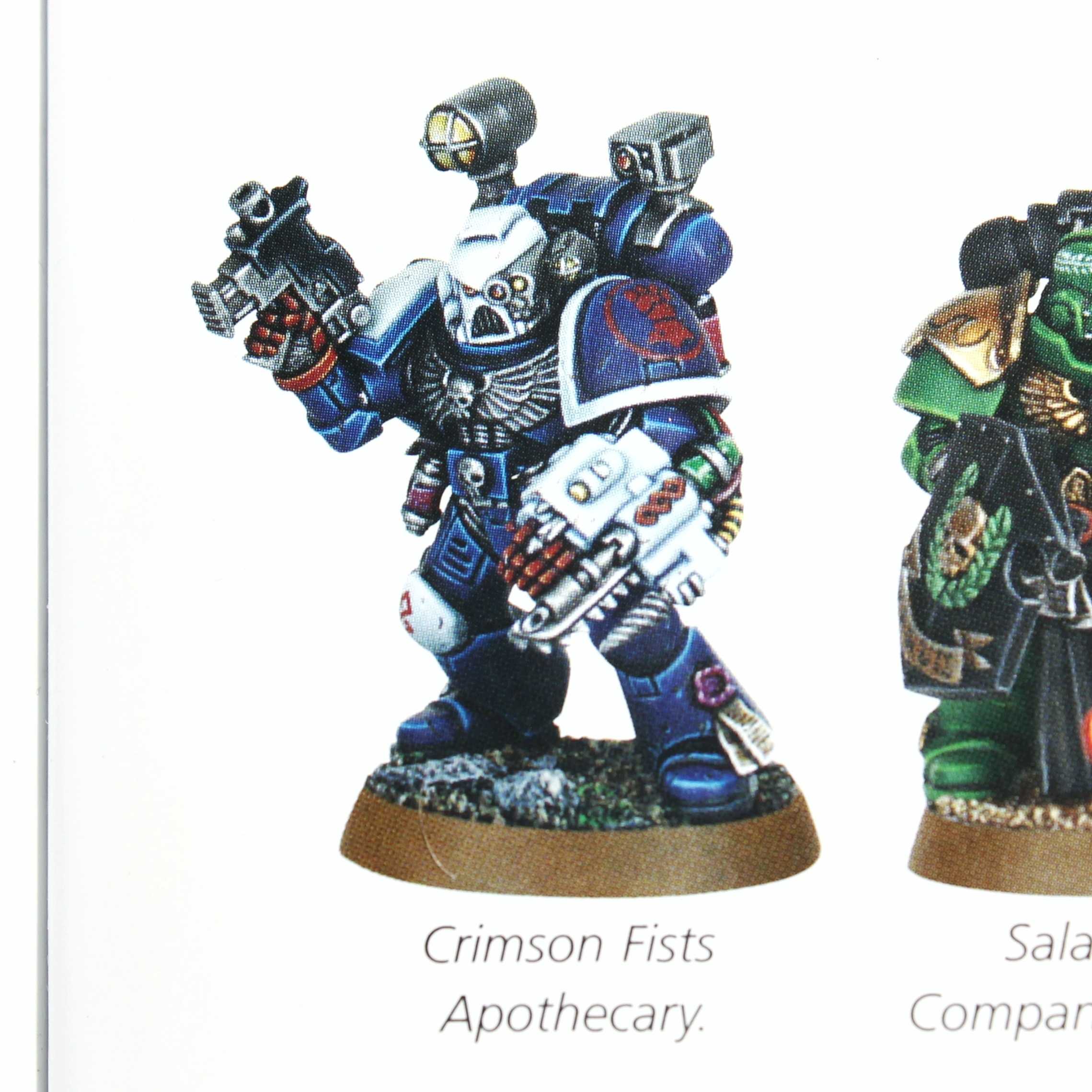 I considered a few options for how I would paint him. Most modern depictions of Apothecaries have them clad in all white, usually with a single shoulder in their chapter colours. But this is a nostalgia driven army, so I cracked open my 5th ed Space Marine Codex and found some examples of how the studio painted their Apothecaries fifteen years ago, and used that as my reference.
