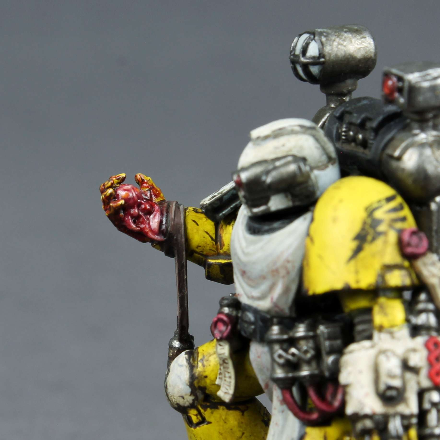 I had this idea in my head of his medic smock being all dirty and bloodstained, so I tried to stipple on a few brownish-red splotches to represent flecks of dried blood. I was a little scared of overdoing it, but looking at it now I think it could have used a little more splattering. Lastly came the dead Space Marine on the base… I figured painting it as a rival chapter rather than another Malevolent would be perfectly in character. And I mean, who else was I really gonna pick to be that rival chapter :3